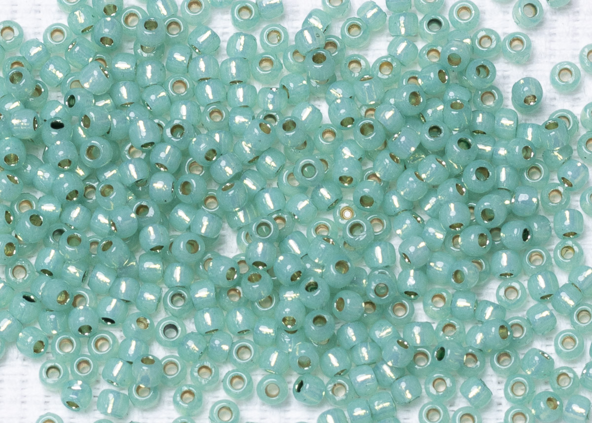 Бисер Япония круглый 11/0 10 г PF2119 молочный темный перидот, серебряная линия внутри